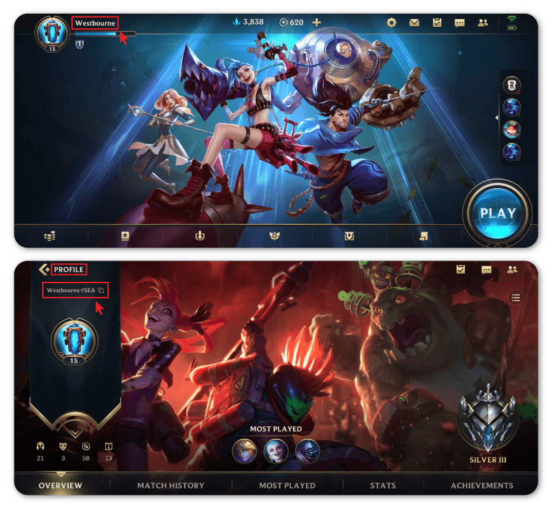 Para encontrar su ID de Riot, seleccione su página de perfil y copie su ID+etiqueta de Riot usando el botón junto a su ID de Riot. (Ejemplo: Westbourne#SEA)